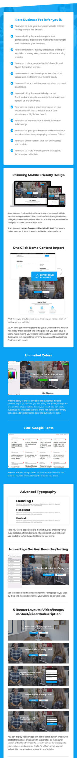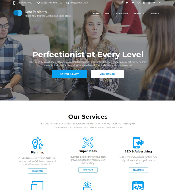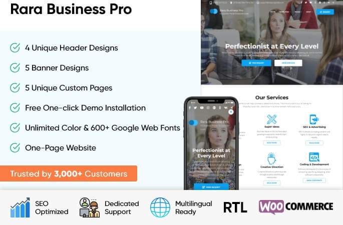 Rara Business is a WordPress theme for business and corporate websites. You can use it to build small business (restaurants/cafe, travel, education, hotel, construction, events, wedding planners, fitness, affiliate, fashion, lawyer, consulting, sport/medical shops, spa/temas, political), portfolio, church, online agencies and firms, charity, ecommerce (WooCommerce), and freelancers websites. Rara Business is widgetized, visually appealing and clean. It is responsive, Schema.org compatible, SEO friendly, RTL compatible, speed optimized, and translation ready.